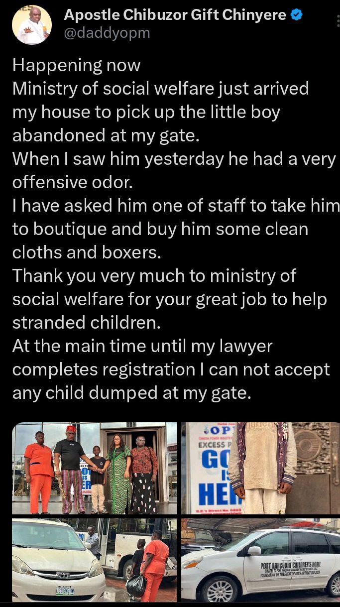 “Happening now, Ministry of Social Welfare just arrived my house to pick up the little boy abandoned at my gate,” he wrote on his X handle earlier.