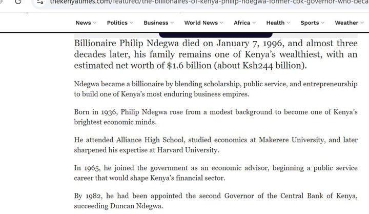 Ndegwa, a respected economist and former Governor of the Central Bank of Kenya, died on January 7, 1996, leaving behind not only a reputation for strategic leadership but also a vast business empire. Today, his family stands among the wealthiest in Kenya, with an estimated net worth exceeding Ksh244 billion (about $1.6 billion).
