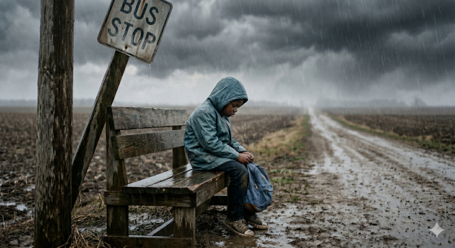Just a wooden bench, half-broken, and a narrow road stretching endlessly into the distance.