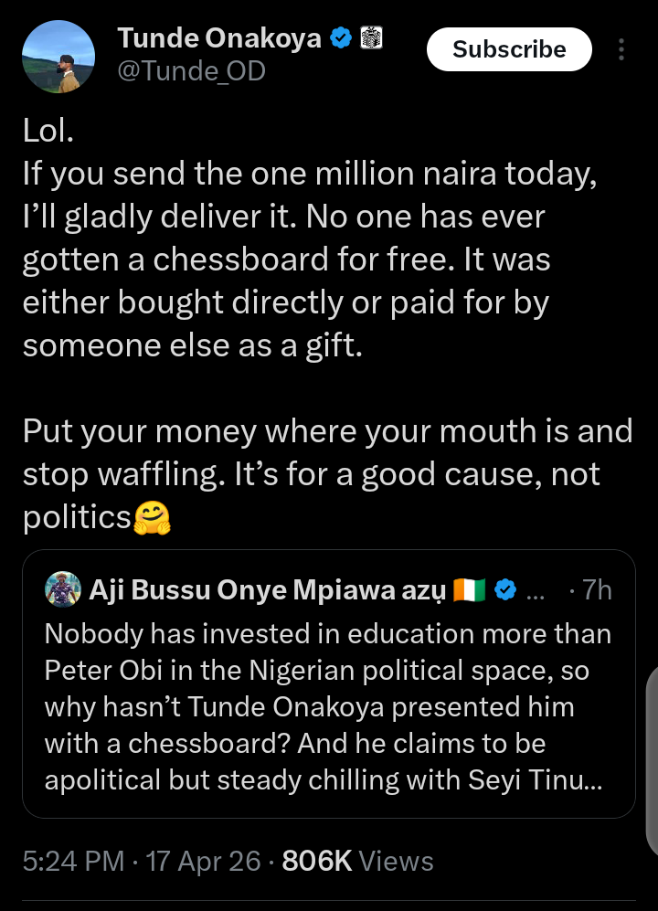 “Nobody has invested in education more than Peter Obi in the Nigerian political space, so why hasn’t Tunde Onakoya presented him with a chessboard? And he claims to be apolitical”.